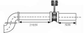 5.不同平面兩個彎管的安裝 如果流量計的前端有兩個90°彎頭,要保證流量計的前直管段≥25D,后直管段≥5D |