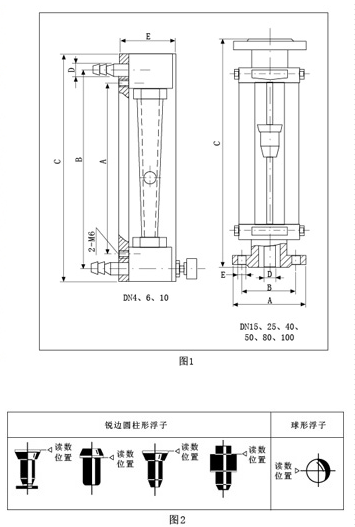 LZB/LZB-( )F流量計的錐管為光滑內壁管(見圖4),通徑DN15以上的流量計,浮子通過導桿 上下移動,保持穩(wěn)定;LZJ/LZJ-( )F流量計錐管 內壁有三條導向凸筋,使浮子保持穩(wěn)定(見圖4)。通徑DN10以下的流量計采用軟管連接,配有 針形流量調節(jié)閥;通徑DN15以上流量計采用法蘭連接。